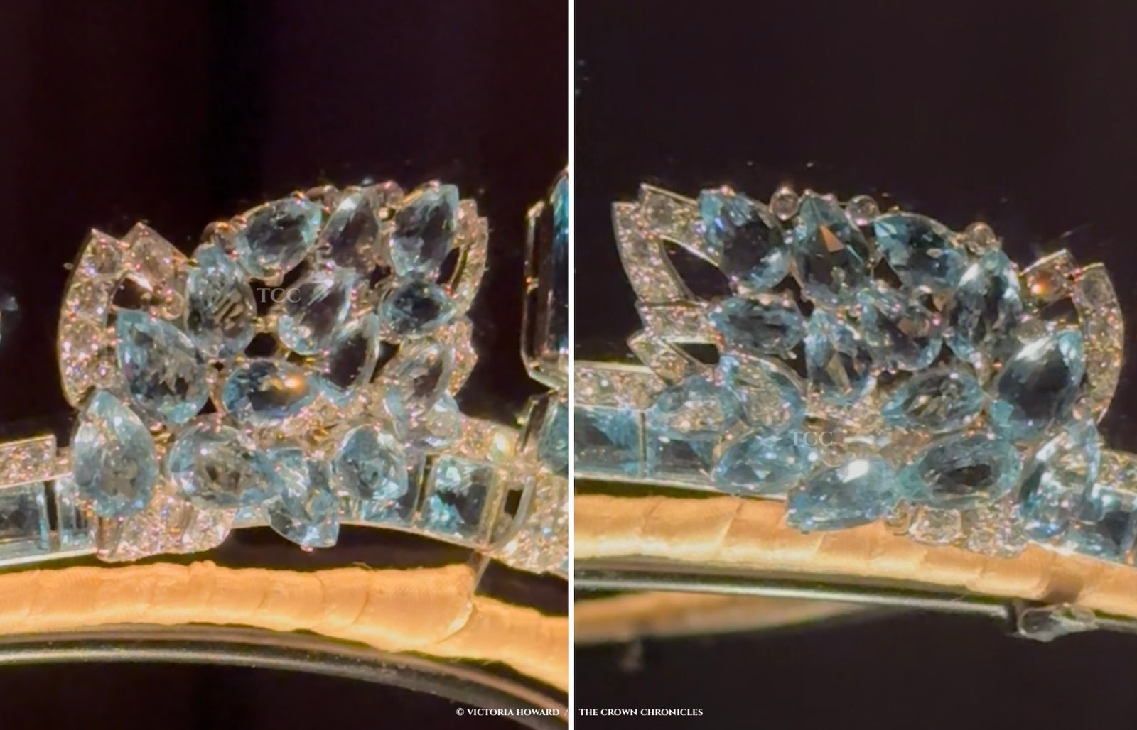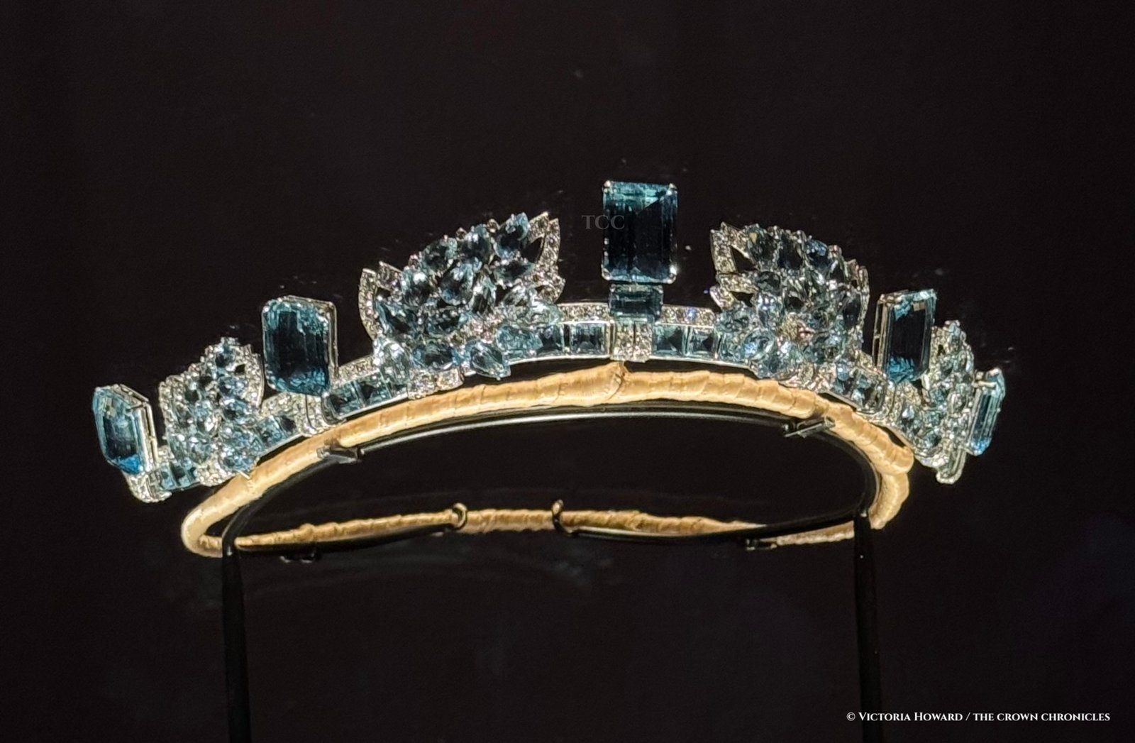 It was made by Cartier in 1937 and displays alternating pinecone motifs and large emerald cut aquamarine stones set in platinum. Unusually the base band features the blue stones too (most tiaras feature only diamonds in their band, I have always assumed to provide more impact to coloured stones above, and since the band may be covered by hair when worn); a thinner diamond band sits above it.