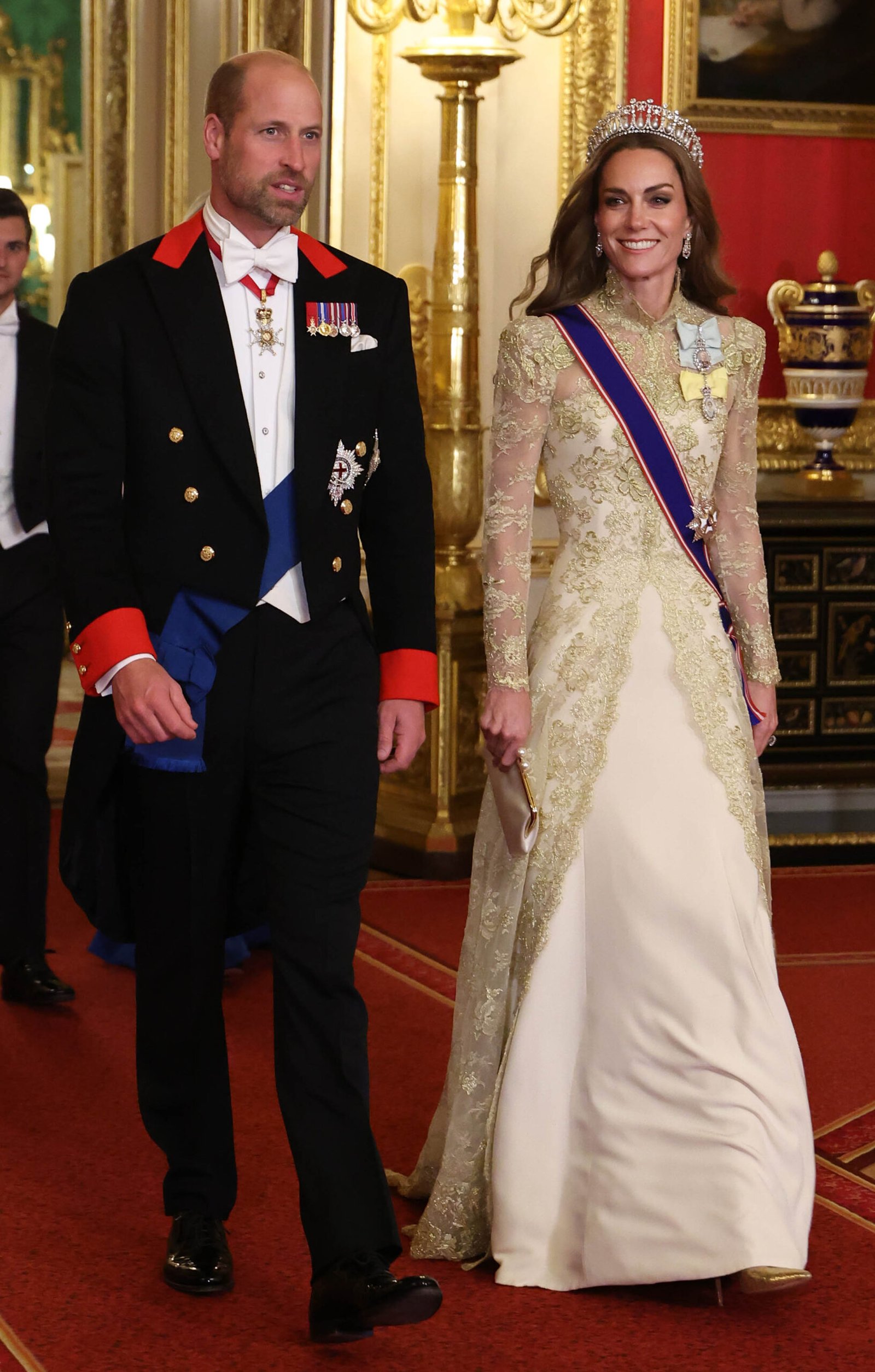 The Princess of Wales wore a couture Phillipa Leple hand-embroidered gold Chantilly lace evening coat over a silk crepe dress, paired with the Lover’s Knot tiara and a pair of the late Queen’s earrings.