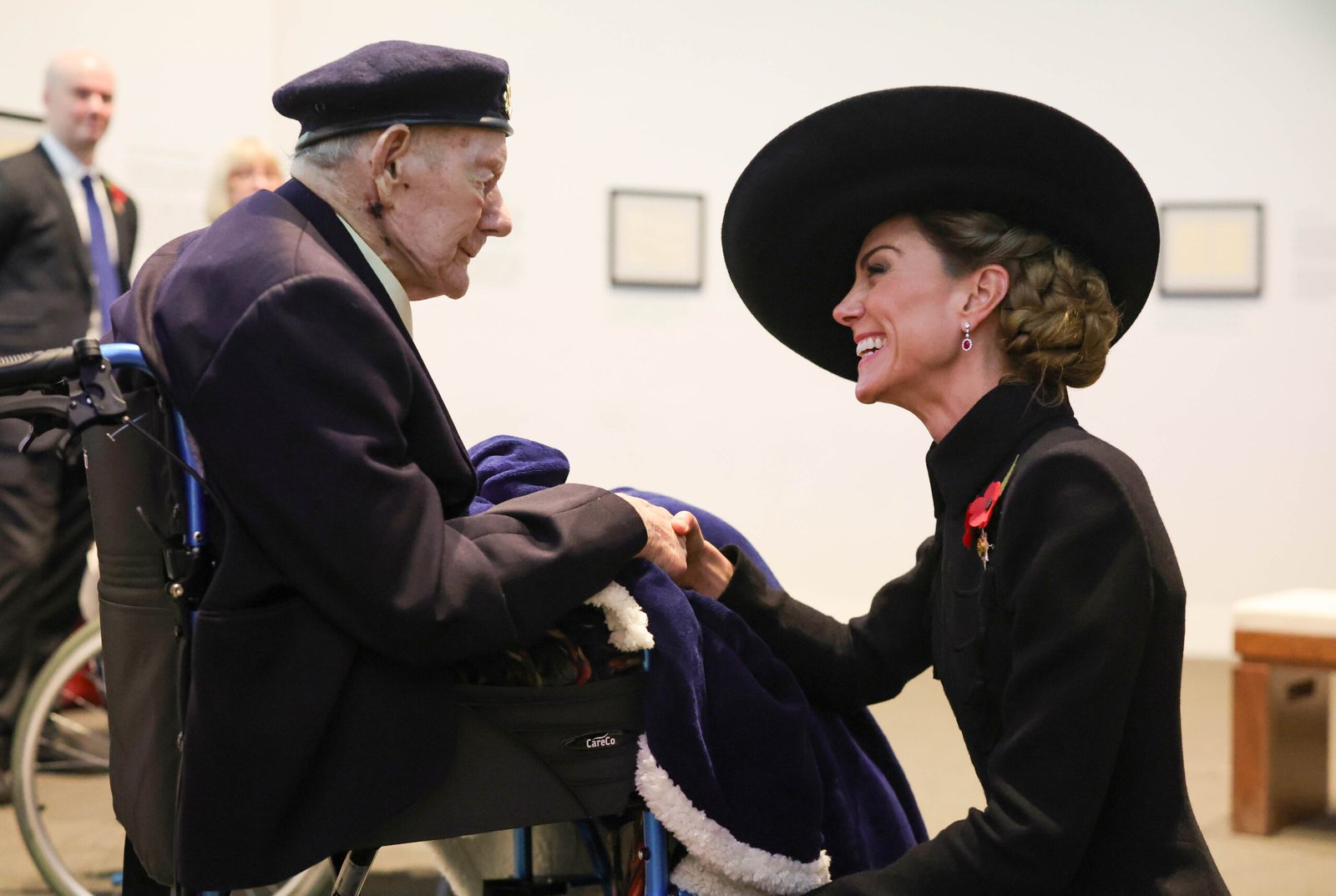 She held the hand of VE and VJ Day veteran Donald Redston as the 100-year-old told her about the keep-fit regime he credits for keeping him well. Asked for his top tips by Catherine, Mr Redston told Kate he used to run marathons, including the London Marathon aged 65 and the New York Marathon aged 66.