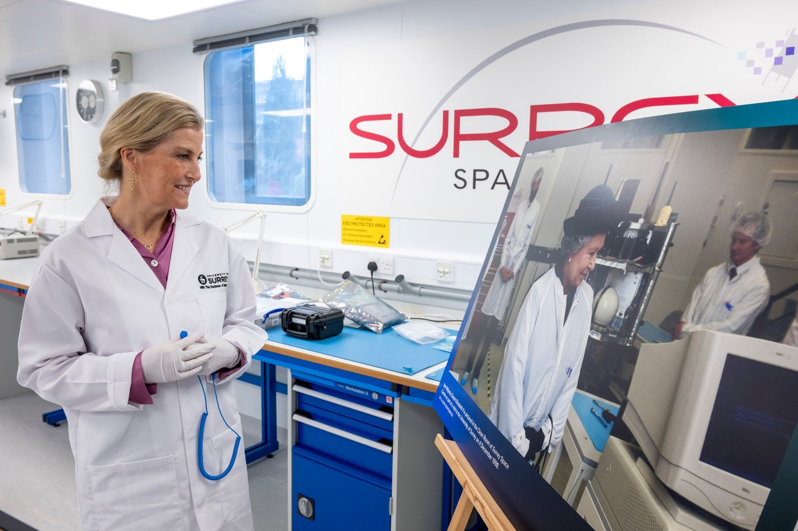 The Duke, as Chancellor of the University, and The Duchess paired up at the Surrey Space Centre, where they visited labs to see a student designed satellite deploy pod which will push a payload from a rocket into space. Sophie then went on to help fit a panel engraved with Prince Edward and Sophie’s Royal Cyphers to Jovian-1, a satellite which Surrey students helped develop.